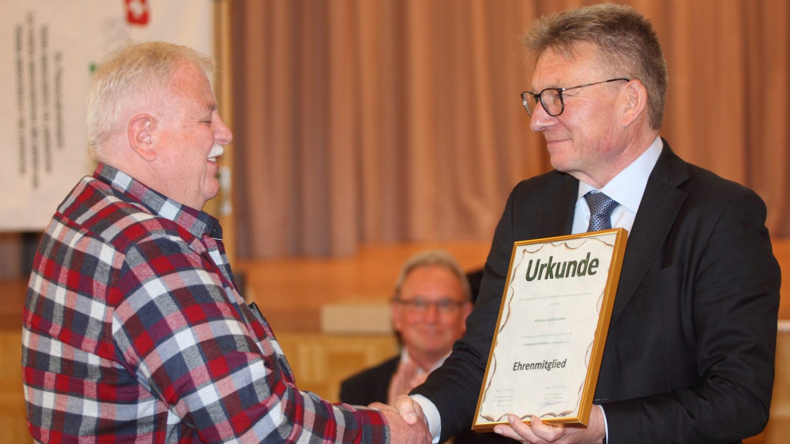 Pour des raisons professionnelles, Adrian Wüthrich, Président et directeur de Travail Suisse, ne pouvait être présent. Il s’adressa à l’assemblée par un message vidéo qui, pour des raisons techniques, fut un message audio. À tous, il souhaita une bonne assemblée et se réjouit aussi de la collaboration continue – avant tout dans le domaine important du programme de formation continue ARC. ■ (Photo: Markus Meyer, Président central (à droite) remet le diplôme de membre d’honneur à Markus Zurbuchen, membre d’honneur fraîchement nommé.) (Photo Beat Wenzinger)