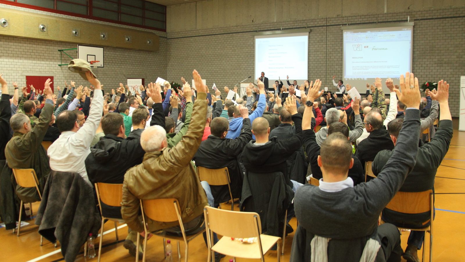 En 2019, la Suisse recevait sa première ministre de la défense en la personne de la Conseillère nationale valaisanne PDC Viola Amherd. Cette élection a été saluée dans de larges cercles comme coup de chance pour l’armée en mutation et, en particulier, pour l’importance éminente de la votation populaire du 27 septembre 2020 sur l’acquisition de nouveaux avions de combat. Ceci a été une parfaite partie de poker: le crédit cadre de 6 milliards de francs a été accepté avec une mince majorité de 50,1 % des voix. ■ (Lors de l’assemblée extraordinaire de l’AdI sur l’âge de la retraite planifié à 65 ans, les instructeurs adoptent à l’unanimité la résolution «Pas d’autre réduction de prestation chez le personnel militaire».) (Photo Beat Wenzinger)