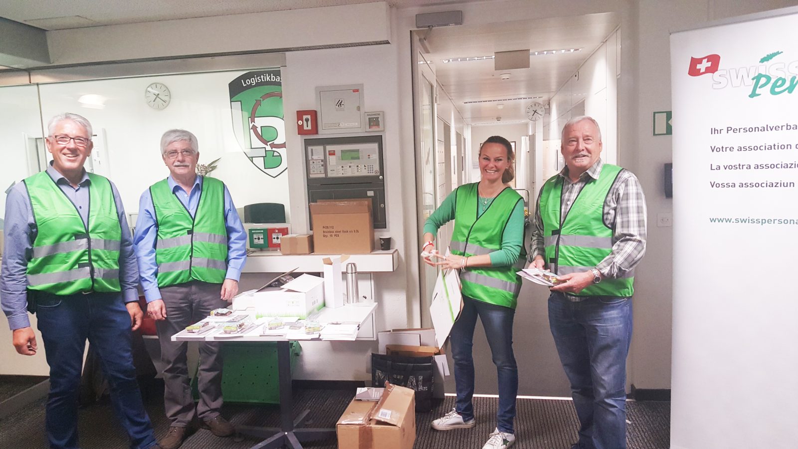 An diesem Standort arbeiten zirka 140 Verwaltungsangestellte in diversen Tätigkeiten und Abteilungen. Viele neue und junge Leute, die ihre Arbeit in den vergangenen Monaten in diesem Gebäude aufgenommen haben, gaben Anlass dazu, unseren Verband vorzustellen. Dazu hat uns Oberst i Gst Stephan Zehr als Hausherr grünes Licht gegeben. Dass wir diese Aktion bei der Loge durchführen durften, ist nicht selbstverständlich. Ich möchte mich dafür bei Stephan Zehr nochmals recht herzlich bedanken. Um 5.30 Uhr haben Roland Tribolet und meine Wenigkeit damit begonnen, den Werbestand aufzubauen. Kurze Zeit danach haben sich Daniela Zryd und René Hug vom Vorstand der Sektion Berner Mittelland dem Werbeteam angeschlossen. In der Zeit zwischen 6.00 Uhr und 8.15 Uhr wurden unsere Werbeunterlagen mit einem Kugelschreiber und einer Kreditkartenschutzhülle verteilt. Als süsses Ostergeschenk durften alle einen kleinen Schoggihasen in Empfang nehmen.