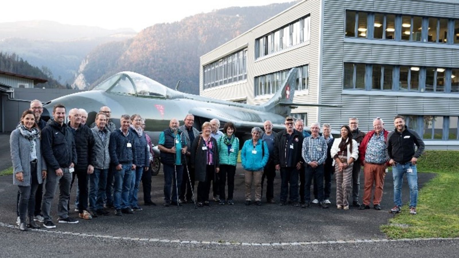 Nach gut zwei Stunden, vielen interessanten Eindrücken und spannenden Informationen traf sich die Gruppe für das Fotoshooting vor dem Hunter auf dem Firmenareal. Nun wird sich der eine oder andere die Frage stellen, was ein Hunter bei der RUAG verloren hat. Bis ins Jahre 1997 war der Standort Interlaken ein festes Standbein der Luftwaffe. Durch die Beschaffung des F/A-18 wurde der Standort Interlaken «heruntergefahren» und der Standort Meiringen «hochgefahren». So war es dann nicht verwunderlich, dass ein paar Pensionäre nach langer Zeit bekannte Gesichter am alten Arbeitsort wiedergesehen haben. Es wurde gelacht, zurückgeschaut und manche Anekdote unter dem Motto «Weisch no…?» ausgetauscht.