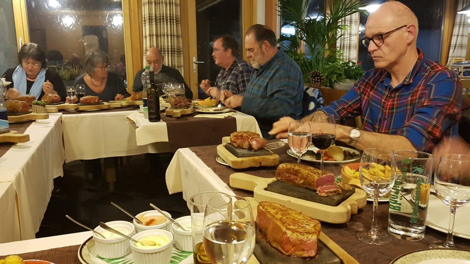 Der nächste Programmpunkt war unser gemeinsames Nachtessen im Restaurant Reichenstein. Das Restaurant Reichenstein ist sehr bekannt für das Anrichten des Fleisches auf «heissem Stein». Zur Auswahl gab es entweder Rinds- oder Pferdefleisch. Als zweites durften wir uns entschieden, ob das Stück Fleisch klein oder gross sein soll. Wie schwer jedoch «klein» beziehungsweise «gross» war, konnte uns das Servicepersonal nicht sagen. Wie aber auf den Bildern zu sehen ist, war auch schon «klein» gross genug. Unsere Schätzung des Gewichts für das grosse Stück Fleisch belief sich auf 600 bis 700 Gramm. Hierzu wurden Pommes-Frites sowie Gemüse serviert. Anstelle des Gemüses konnte auch ein Salat bestellt werden. Auch dieser war viel grösser als sonst irgendwo. Das ganze Essen um den «heissen Stein» herum wurde mit vier leckeren Saucen verfeinert. Als Abschluss versuchten wir uns noch beim Dessert. Wie ja bereits beim Hauptgang gesehen, waren auch die Portionen beim Dessert etwas grösser. Das Preis-/Leistungsverhältnis beim «grossen heissen Stein» inklusive Pommes, Gemüse oder Salat und vier Saucen war mit knapp 50 Franken top. Das Restaurant Reichenstein kann nur bestens weiterempfohlen werden. Werde sicher bei Gelegenheit wieder einmal einen Besuch dort abstatten.